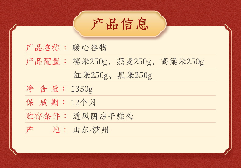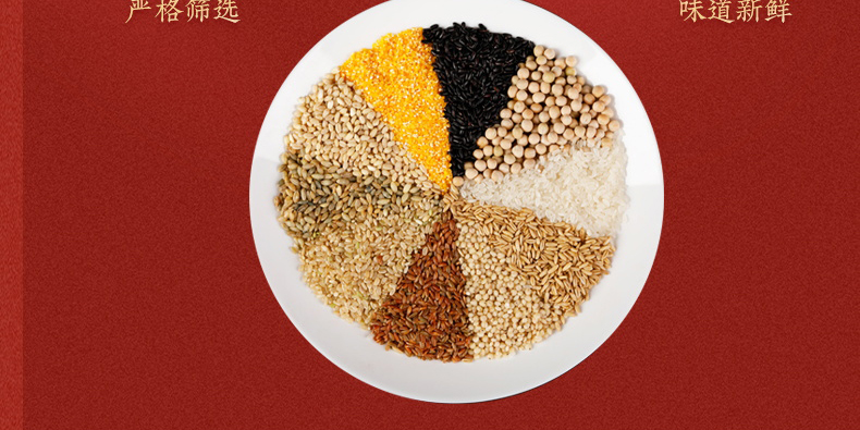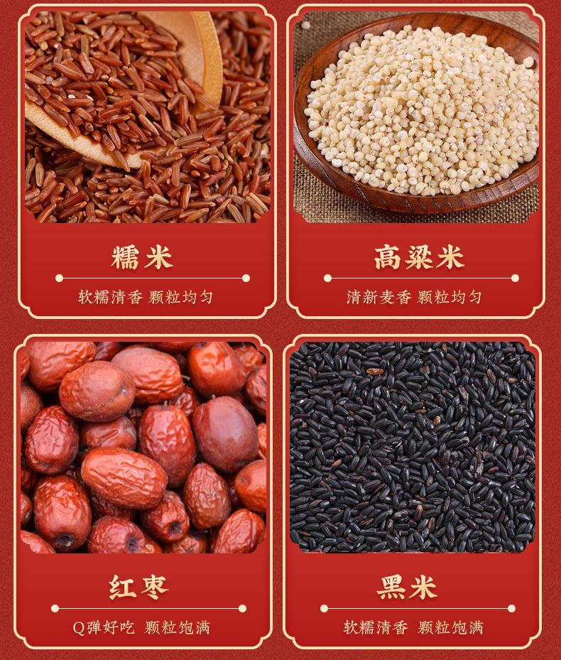 產品規格配置:糯米、燕麥、高粱米、紅米黑米各250g、紅棗100g 盒尺寸:36*9.5*26cm 箱尺寸:60*37.5*54 體 積:0.122方 箱重量:20.4kg